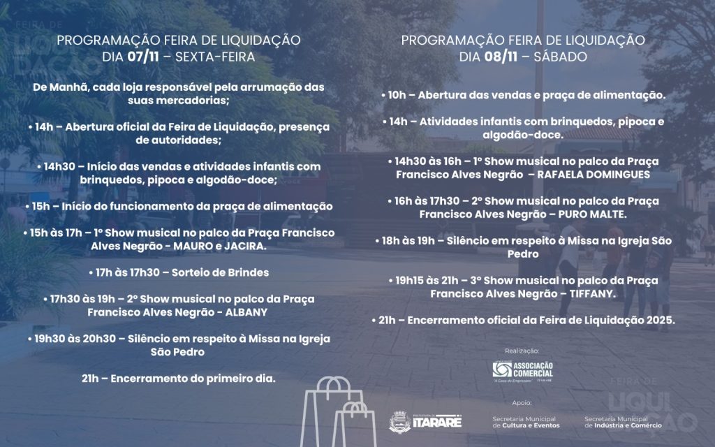 A Feira de Liquidação é uma ótima oportunidade para quem deseja antecipar as compras de fim de ano, prestigiar o comércio itarareense e aproveitar momentos de lazer no centro da cidade.
