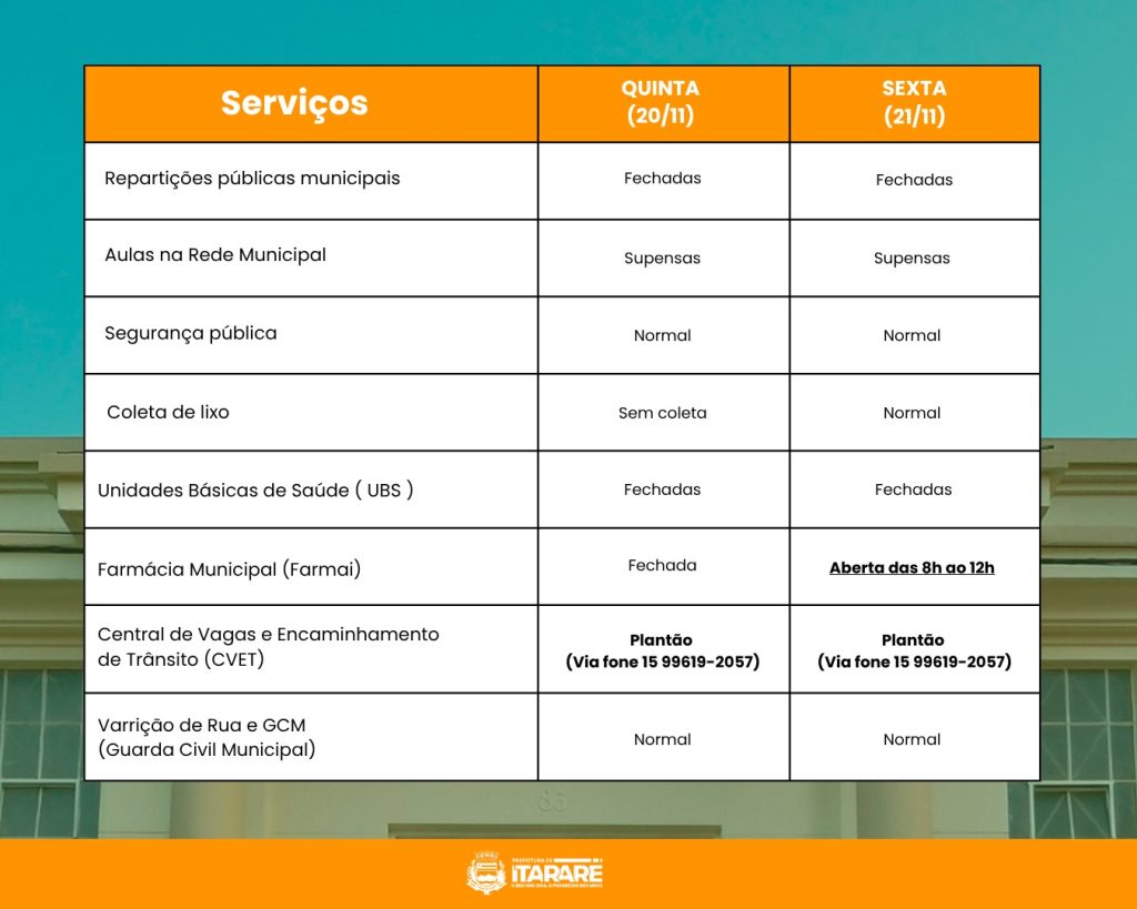 A Prefeitura de Itararé (SP) informa como funcionarão os serviços municipais durante o feriado da Consciência Negra, celebrado na quinta-feira, 20 de novembro, e o ponto facultativo, na sexta-feira, 21 de novembro.